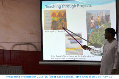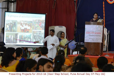 The Annual Presentation of Door Step School NGO, which works for education of underprivileged children in Pune, was organised on 7th of May 2016 at the auditorium in Nivara Oldage Home, Navi Peth. Employees, volunteers, donors, and well-wishers attended the event in large numbers. Door Step School was started in Mumbai by Mrs. Rajani Paranjpe and her ex-student Bina Sheth Lashkari in 1989, with an objective of addressing social problems like inequality, unemployment, and poverty, through education. Later Mrs. Paranjpe shifted to Pune in 1993 and started a branch of Door Step School in Pune. The organisation aims at developing basic literacy skills among underprivileged children through various innovative projects. Door Step School has successfully taken the school, along with teachers and teaching aids, to the doorstep of children especially from migrant communities in the city. Major projects run by Door Step School are – ‘Reading Classes’ for students in Pune and Pimpri-Chinchwad Municipal Corporation schools, ‘Community Learning Centers’ for children living in slums, ‘School-on-Wheels’ Mobile Classroom for children on the roads and in temporary shelters, ‘School Transport’ facility for children living on construction sites, ‘Every Child Counts’ citizens’ campaign to bring out-of-school children into mainstream of formal education under Right To Education Act, ‘Parents’ Participation in Child’s Education’, and other various activities like Science Exhibition, Book Fair, and Action Groups working for Child Rights, etc. During last year, 63,743 children from 240 government schools and 3,748 locations (construction sites, labour habitats, slums, etc.) in Pune and surrounding area benefited from above-mentioned projects of the organisation. Activities conducted during last year under these projects were reviewed in the Annual Presentation Event. The teachers and field-staff from these projects presented their work in an innovative way. An exhibition of teaching aids prepared by and books published by Door Step School was organised on the occasion. A recent addition to the School-on-Wheels buses was also put on display for the guests. While talking about future plans of the organisation, Founder-President Rajani Paranjpe introduced a new project ‘Teach Them Young’, which aims at developing good sanitation and eating habits among students from government schools in Pune. Under this project, awareness about health and hygiene, sanitation, etc. will be created at school-level by involving children and their parents. The project has been launched with survey of sanitation facilities in government schools. The work of making these facilities available wherever required has already been started by coordinating with respective Ward Offices of the Municipal Corporation.