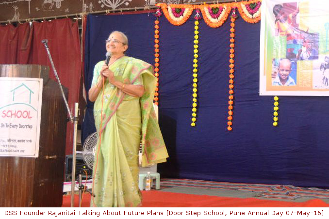 The Annual Presentation of Door Step School NGO, which works for education of underprivileged children in Pune, was organised on 7th of May 2016 at the auditorium in Nivara Oldage Home, Navi Peth. Employees, volunteers, donors, and well-wishers attended the event in large numbers. Door Step School was started in Mumbai by Mrs. Rajani Paranjpe and her ex-student Bina Sheth Lashkari in 1989, with an objective of addressing social problems like inequality, unemployment, and poverty, through education. Later Mrs. Paranjpe shifted to Pune in 1993 and started a branch of Door Step School in Pune. The organisation aims at developing basic literacy skills among underprivileged children through various innovative projects. Door Step School has successfully taken the school, along with teachers and teaching aids, to the doorstep of children especially from migrant communities in the city. Major projects run by Door Step School are – ‘Reading Classes’ for students in Pune and Pimpri-Chinchwad Municipal Corporation schools, ‘Community Learning Centers’ for children living in slums, ‘School-on-Wheels’ Mobile Classroom for children on the roads and in temporary shelters, ‘School Transport’ facility for children living on construction sites, ‘Every Child Counts’ citizens’ campaign to bring out-of-school children into mainstream of formal education under Right To Education Act, ‘Parents’ Participation in Child’s Education’, and other various activities like Science Exhibition, Book Fair, and Action Groups working for Child Rights, etc. During last year, 63,743 children from 240 government schools and 3,748 locations (construction sites, labour habitats, slums, etc.) in Pune and surrounding area benefited from above-mentioned projects of the organisation. Activities conducted during last year under these projects were reviewed in the Annual Presentation Event. The teachers and field-staff from these projects presented their work in an innovative way. An exhibition of teaching aids prepared by and books published by Door Step School was organised on the occasion. A recent addition to the School-on-Wheels buses was also put on display for the guests. While talking about future plans of the organisation, Founder-President Rajani Paranjpe introduced a new project ‘Teach Them Young’, which aims at developing good sanitation and eating habits among students from government schools in Pune. Under this project, awareness about health and hygiene, sanitation, etc. will be created at school-level by involving children and their parents. The project has been launched with survey of sanitation facilities in government schools. The work of making these facilities available wherever required has already been started by coordinating with respective Ward Offices of the Municipal Corporation.