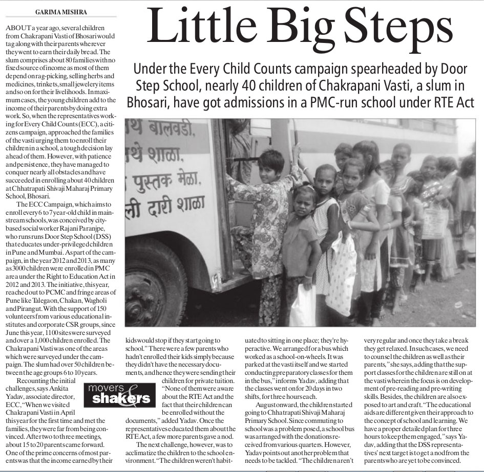 Under the Every Child Counts campaign spearheaded by Door Step School, nearly 40 children of Chkrapani Vasti, a slum in Bhosari, have got admissions in PMC run school under RTE act.